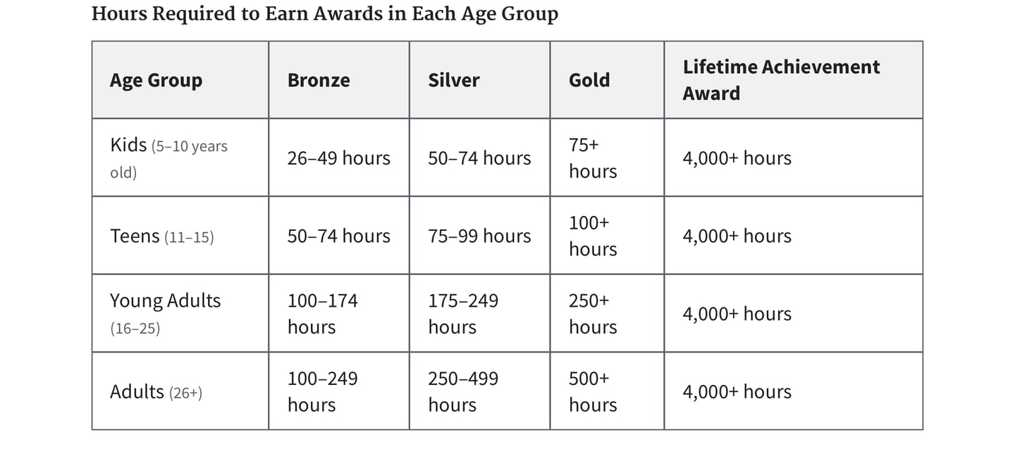 Completes eligible service within a 12-month period (for annual Bronze, Silver, and Gold Awards) and over a lifetime (for Lifetime Achievement Awards)